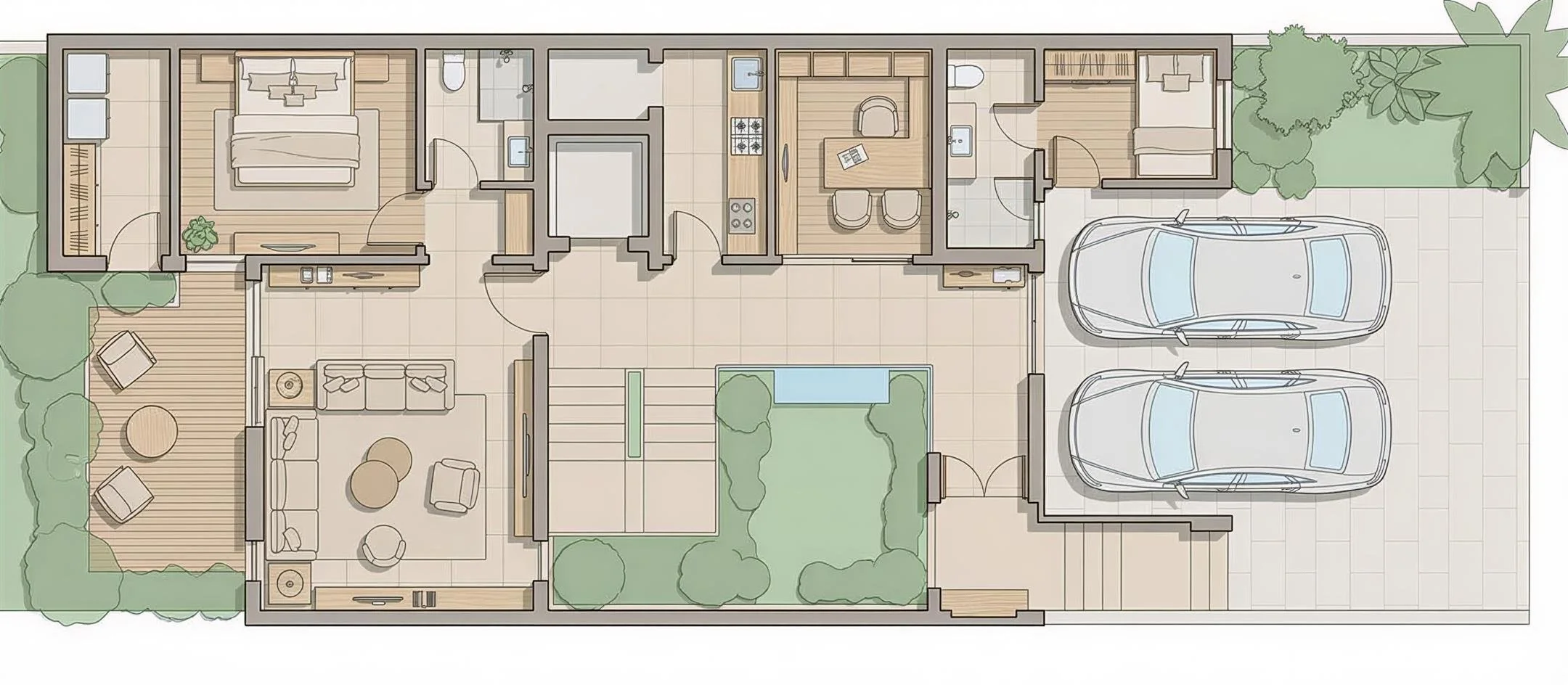 Leela is conceived around a central green courtyard — the heart of the home. Anchored by a skylight above, natural light filters down through double-height volumes, nurturing both the indoor landscape and the everyday rituals of living.