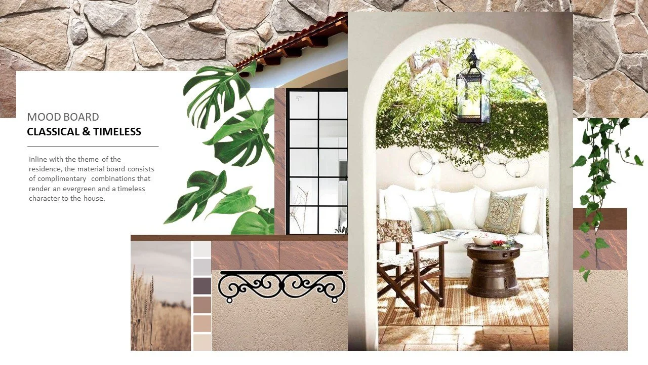 The wall lamps add an antique and vintage twist to the whole building. The ornamentation around the arch helps decorate and beautify it. It is shaped organically to break the monotony of the whole vertical and horizontal lines. The creepers which are included in the elevations of the building emphasize the natural flow of growing. The growth of these plants demonstrates the coherent manner in which nature exists.