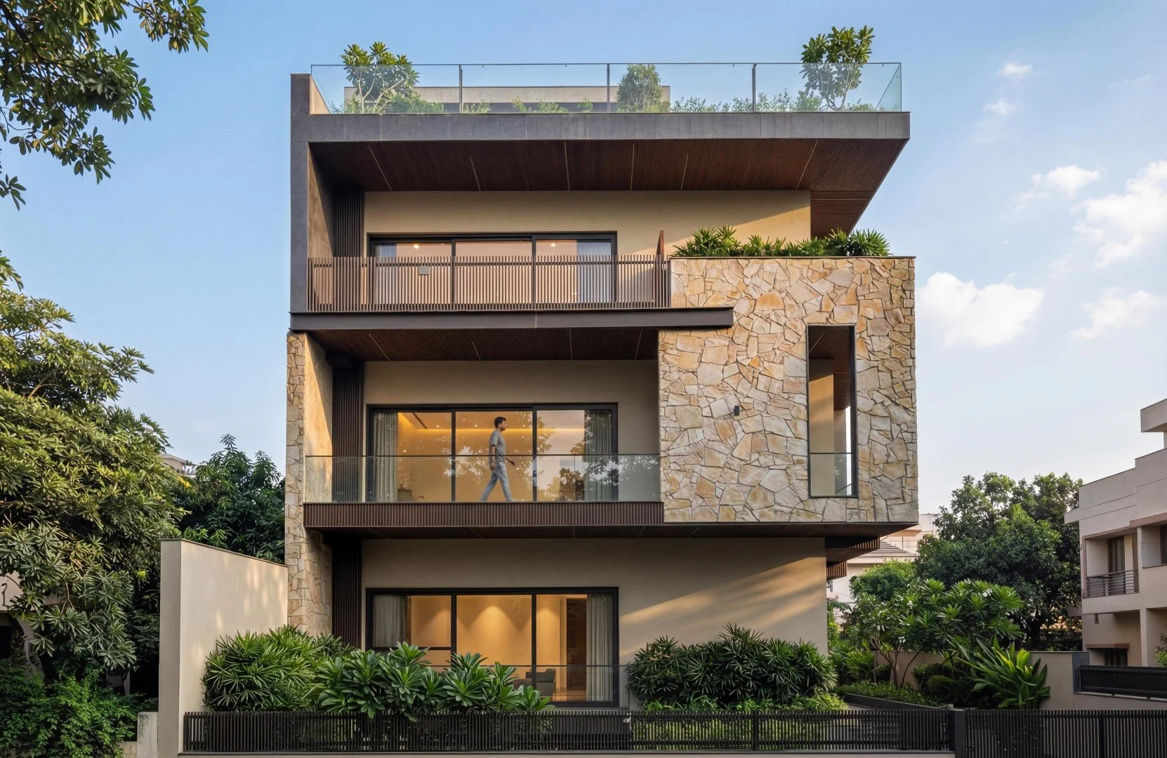 Verdant is conceived as a calm, inward-looking home where architecture and nature quietly coexist. The design leans on warm, tactile materials—natural stone, wood ceilings, and soft neutral finishes—to create spaces that feel grounded yet refined. Generous openings, courtyards, and filtered light blur the boundary between inside and outside, allowing greenery to become a constant visual companion throughout the house.