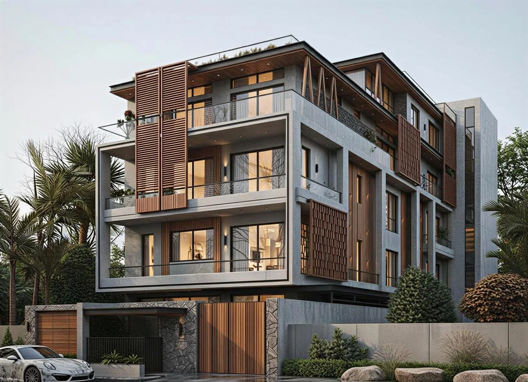 Ember, located in the lush setting of Ghitorni Farms, Delhi, is envisioned as a contemporary retreat that balances bold architectural expression with grounded warmth. The residence is defined by strong horizontal lines, deep overhangs, and layered volumes that create a sense of calm solidity while remaining visually light.