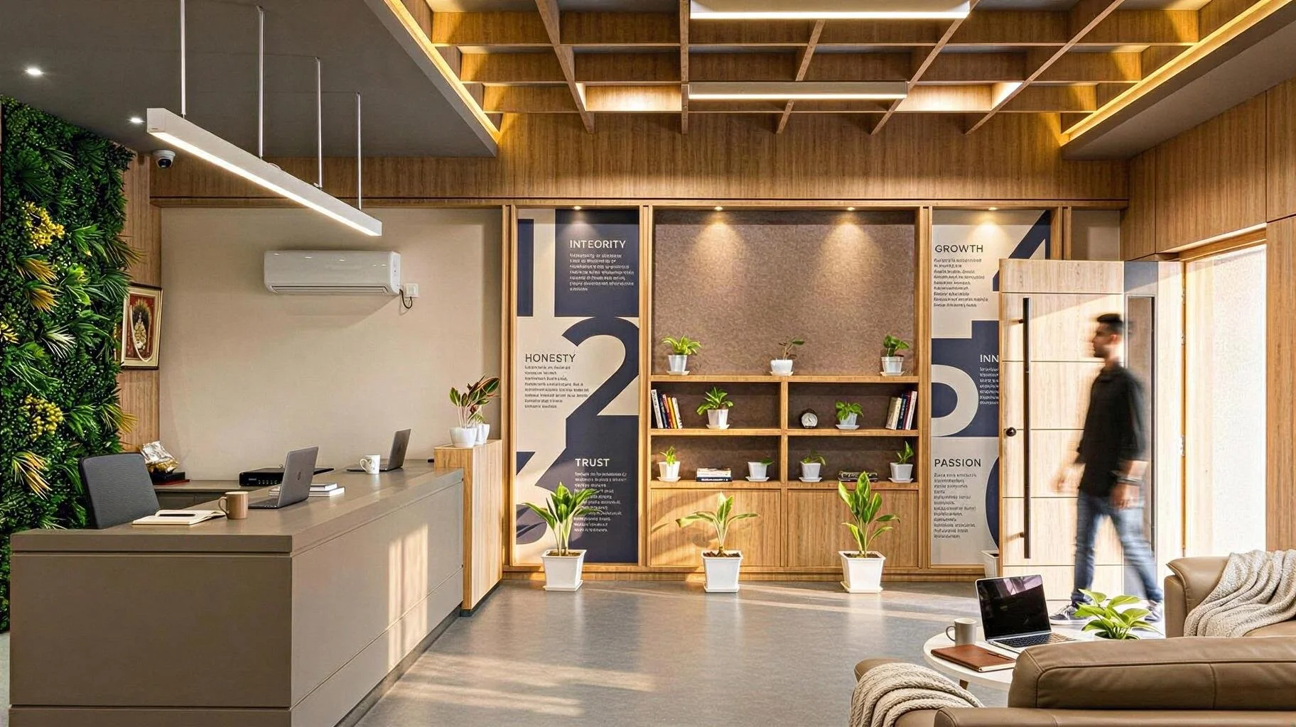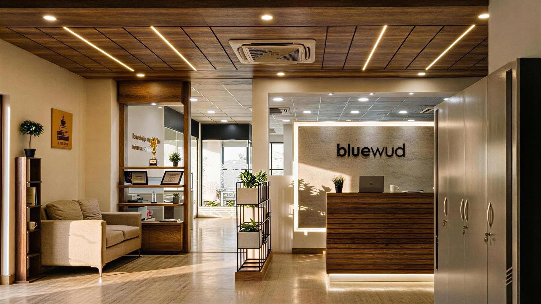 The Bluewud office and experience space in Noida reflects a clean, contemporary identity rooted in precision and craftsmanship. Warm wooden textures, soft lighting, and a restrained material palette create a welcoming yet professional environment.