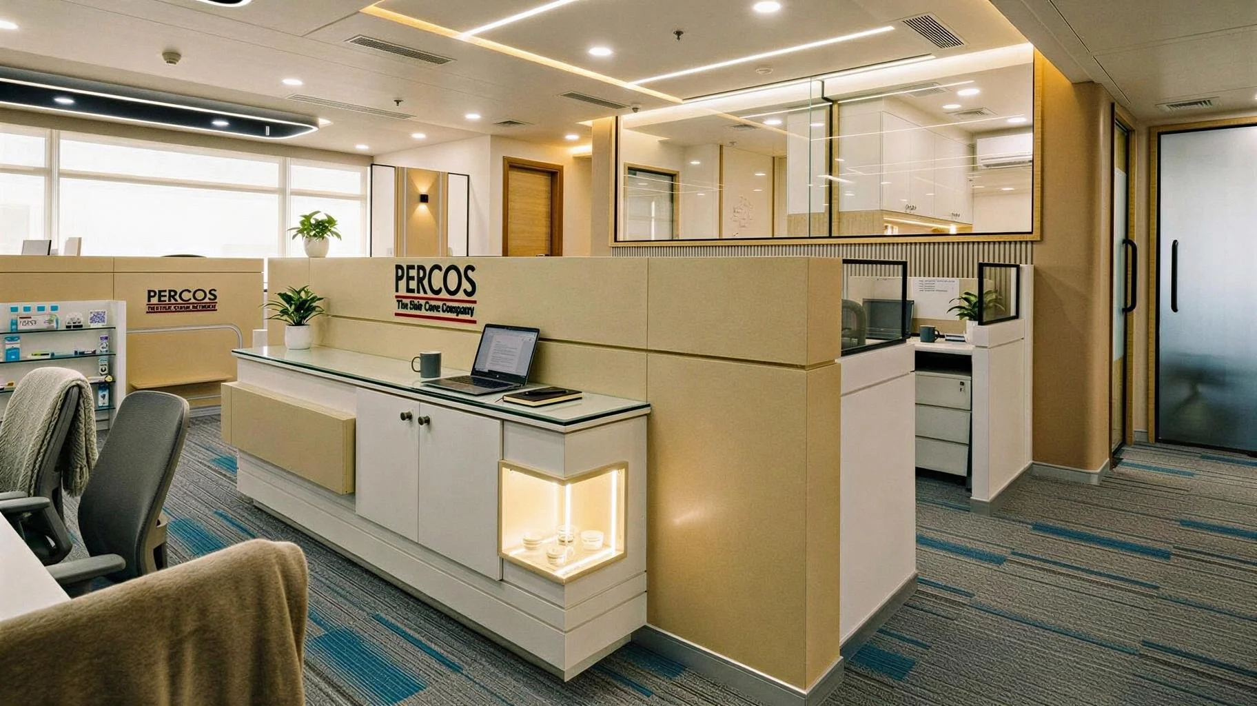 Glass partitions and controlled lighting bring openness and transparency without disturbing functional zoning. Subtle material detailing and ergonomic furniture enhance comfort for both employees and visitors. The design supports a customer-focused workflow—efficient, welcoming, and aligned with Percos’ service-driven ethos.