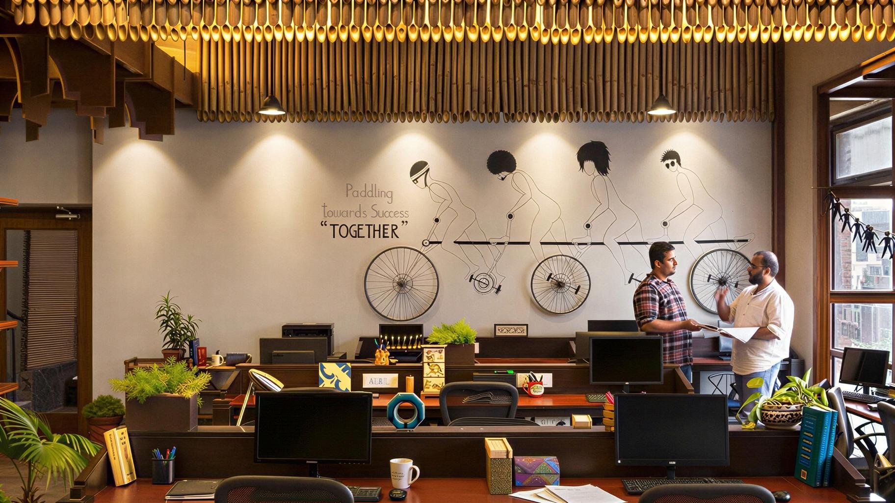 Unboxed Coworking Office is envisioned as a vibrant, collaborative workspace that celebrates teamwork and shared growth. The bold wall art and playful graphics set an inspiring tone, reinforcing the idea of moving forward together.