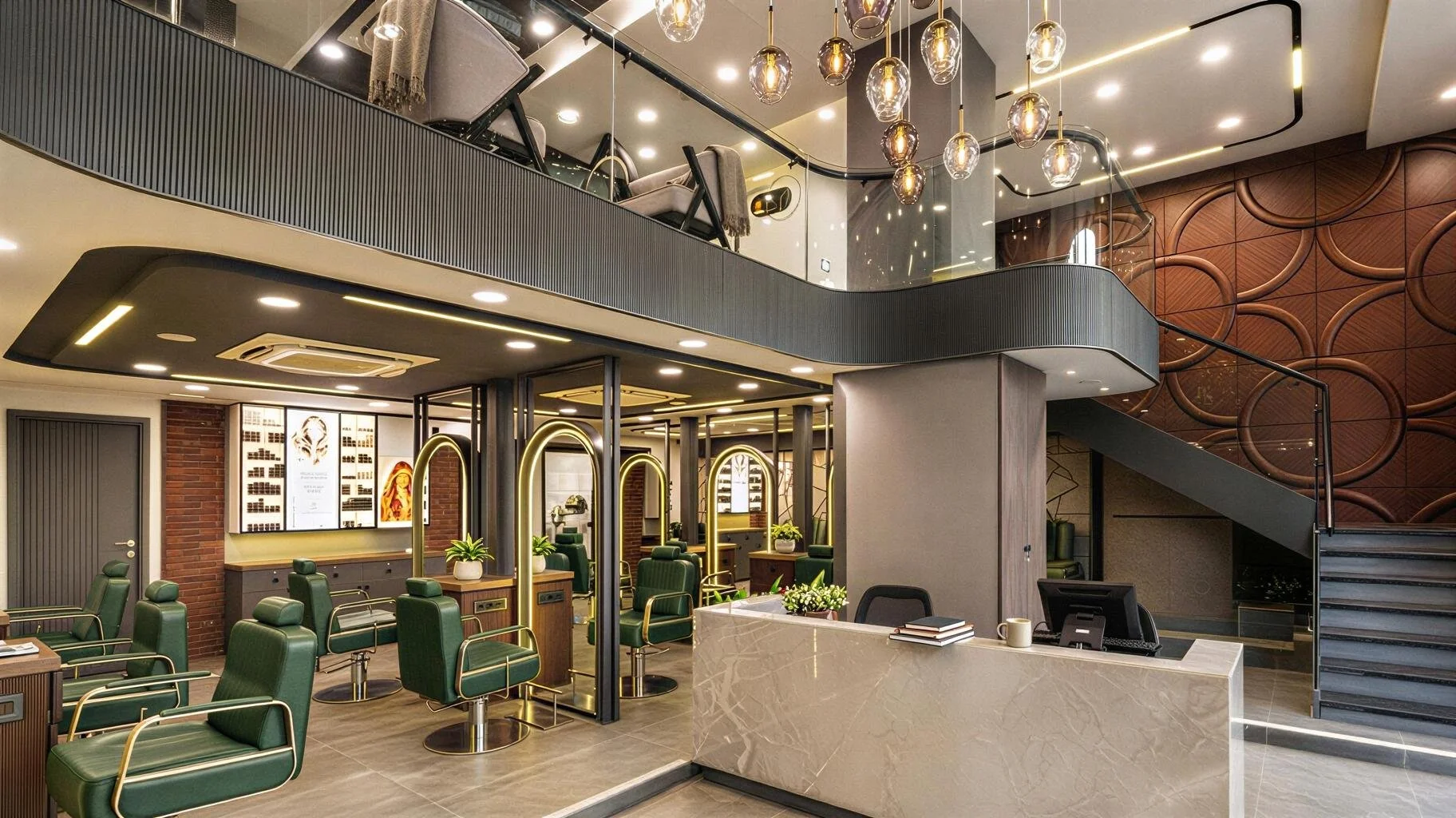The double-height volume enhances openness and adds a sense of spatial elegance to the salon experience.
